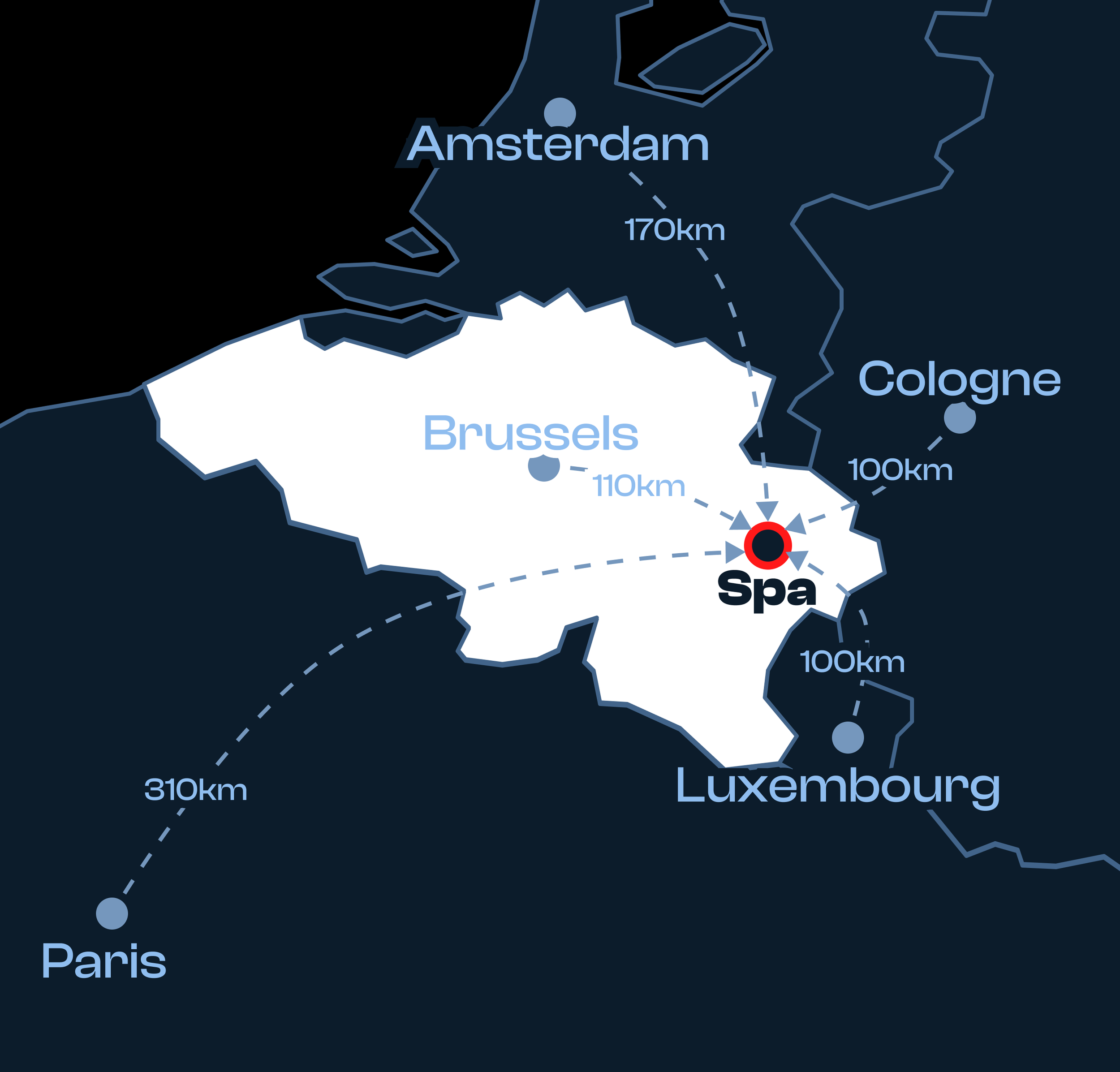 Située à seulement 110 km de Bruxelles, 100 km de Luxembourg et de Cologne, 170 km d’Amsterdam et 310 km de Paris, Spa bénéficie d’une localisation idéale au centre de l’Europe.