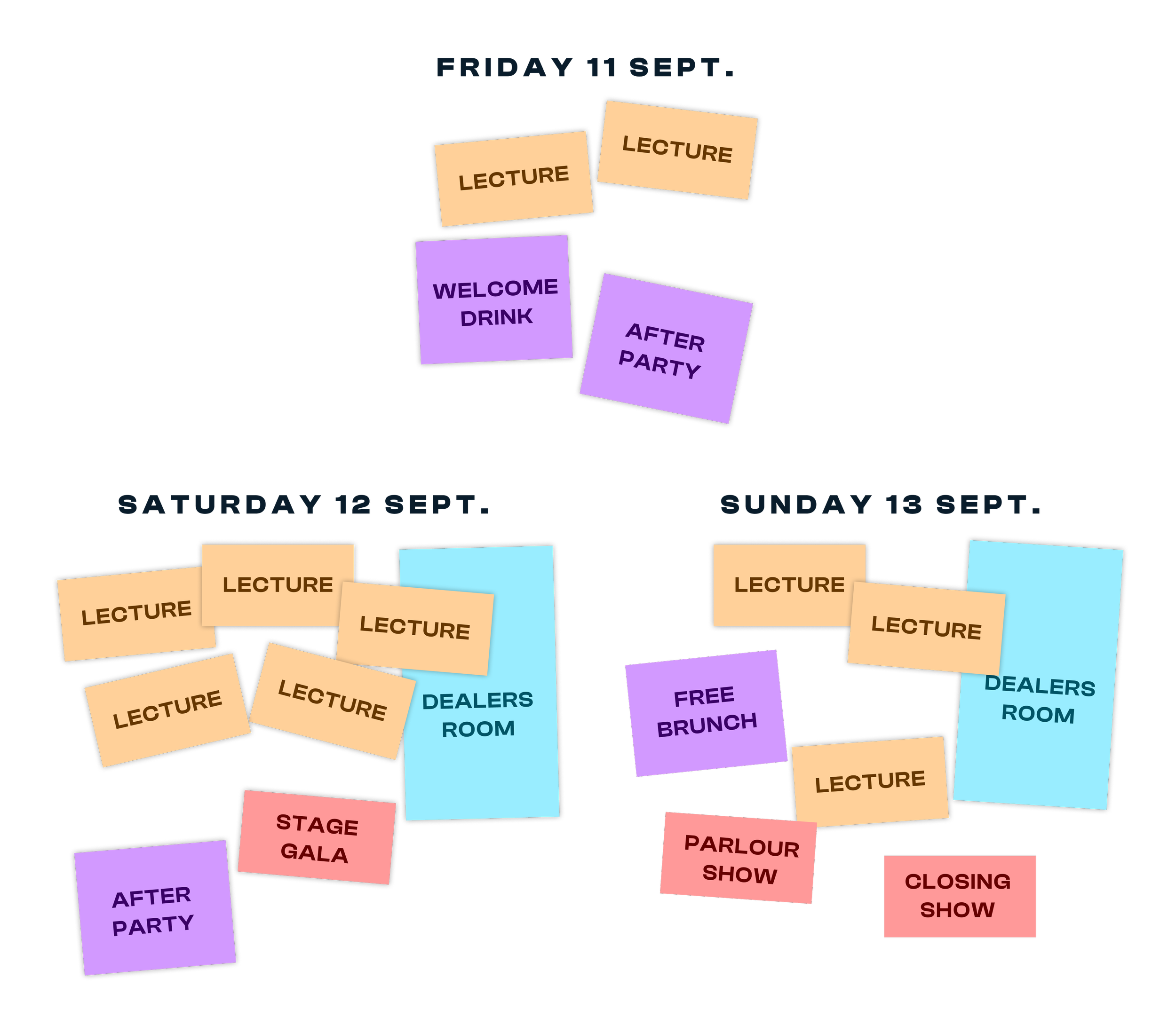 Un verre d’accueil pour lancer les festivités, des conférences inspirantes, des after-parties avec frites et bières belges offertes, un Gala International, un Gala « Parlour », un show exceptionnel, les meilleurs marchands spécialisés, un brunch offert… et une multitude de surprises tout au long du week-end !